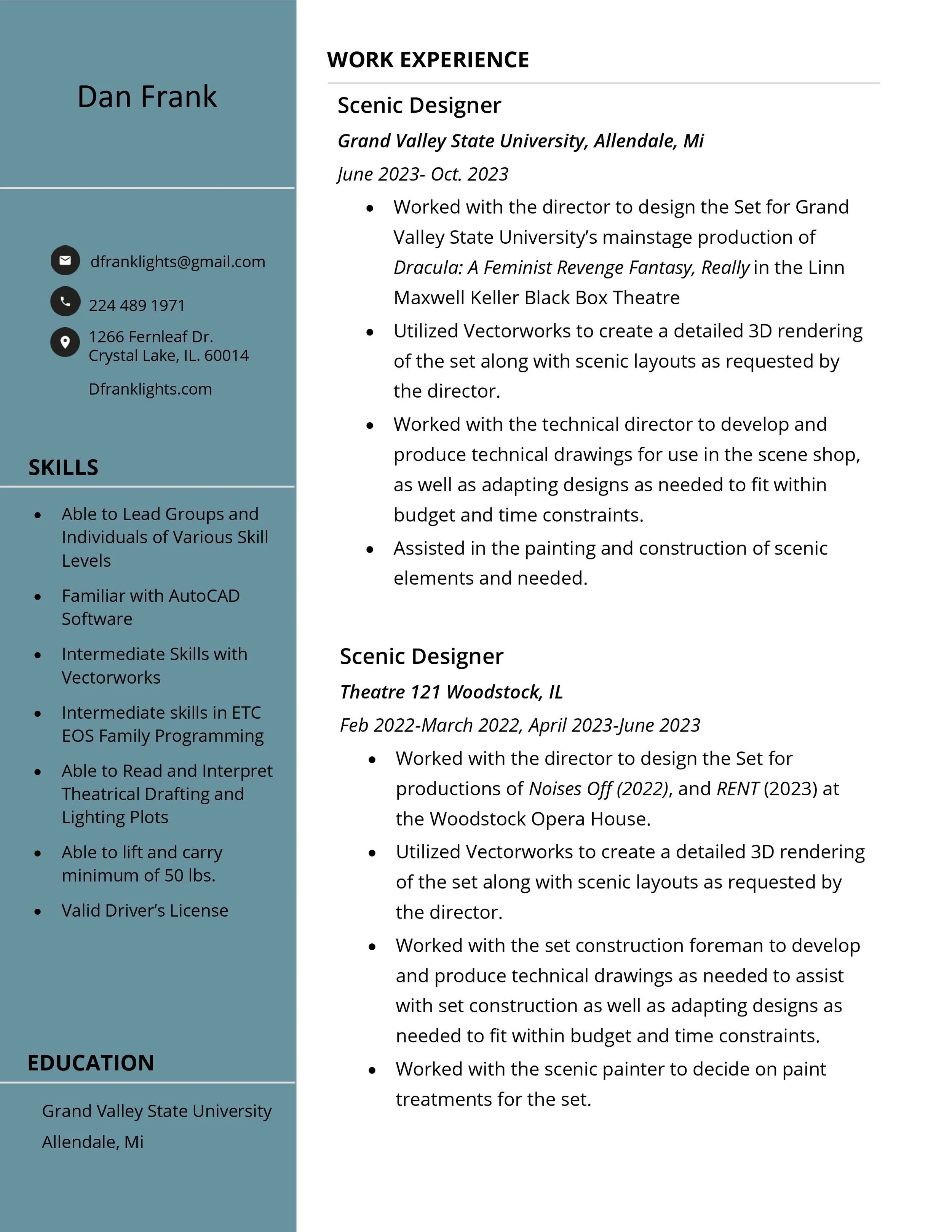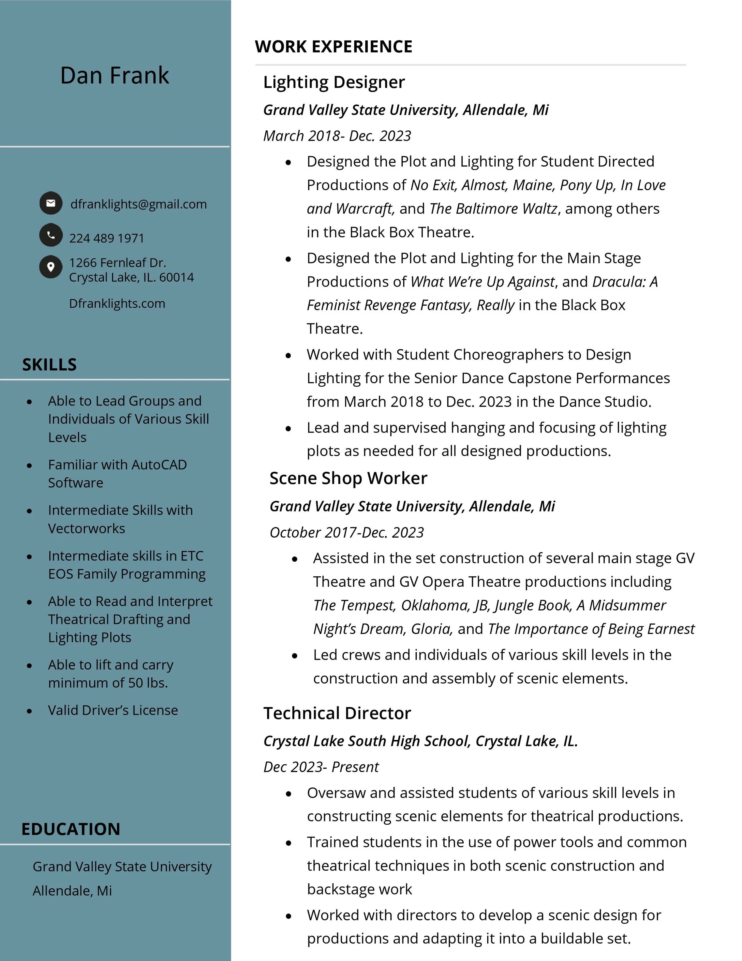 Lighting Resume (Last Updated: June 2024) Scenic Resume (Last Updated: April 2024) Click the links below to download as a .pdf LightingScenic